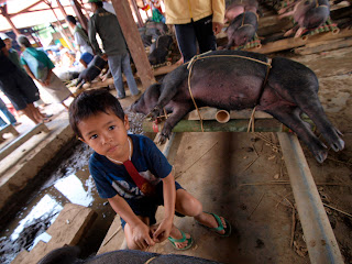 En el mercado había un gran trasiego de personas y animales. Mientras que los búfalos (el animal más importante y considerado) estaban atados a una anilla en sus hocicos y eran limpiados para tener una apariencia de lo más lustrosa, buena parte de los cerdos estaban inmovilizados con cuerdas y palos para su cómodo transporte y descuartizamiento.